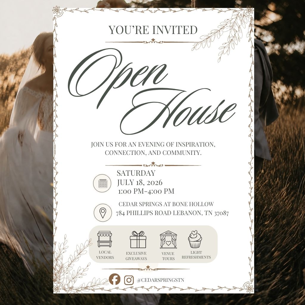 Just minutes from downtown Lebanon, Tennessee, and nestled in the scenic countryside, Cedar Springs offers an exclusive and serene setting for weddings, parties, family reunions, and more. With stunning views and a secluded location, it’s the perfect backdrop for unforgettable moments, conveniently located near Nashville.